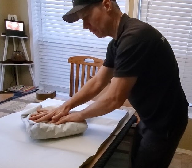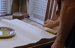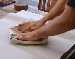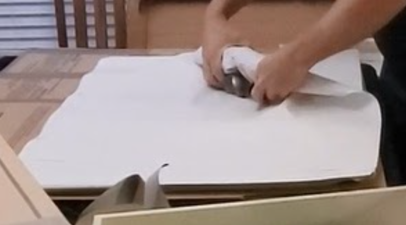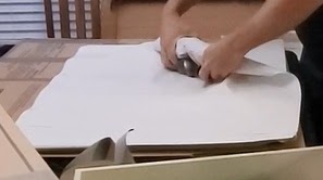 After stretch wrapping the corners on, without ever touching the screen, slide it into the smaller end of the TV box.