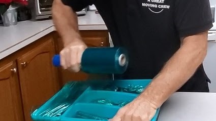 Either you or the moving crew can stretch-wrap a lot of things right in place if they already fit well in a piece of furniture, like in this picture above. But all glass and ceramic items need to be wrapped.