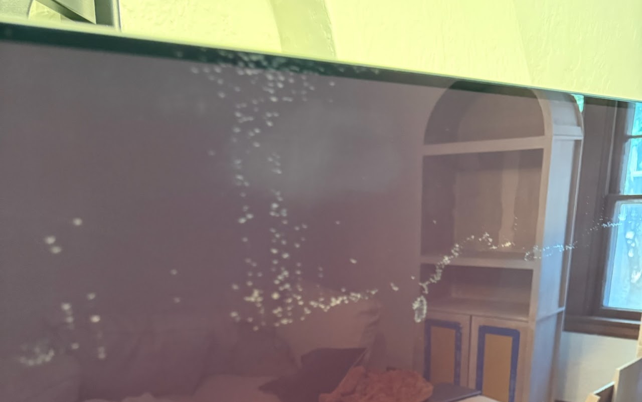 But there is also potential for other areas of the screen to be rubbed, even in the TV box. Any Styrofoam touching the screen anywhere causes this potential for rubbing the screen (as shown above, which cost a damage claim of $1300). It’s not likely, unless you have foam rubber touching the screen somewhere (which this one did), but there is this potential unless you add a TV screen cover.