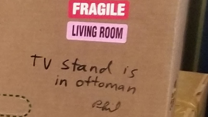 Then label it, and include the location of source room (to identify the TV), and identify where the TV stand is stowed. If there is more than one packer packing the house, add the name of the packer (for accountability).