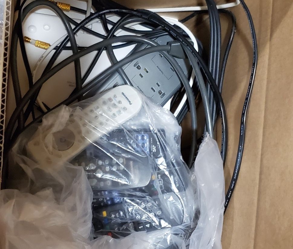 It’s a good idea to make an “Electronics” box for all remotes, cables, phone chargers, cords, and other small accessories.