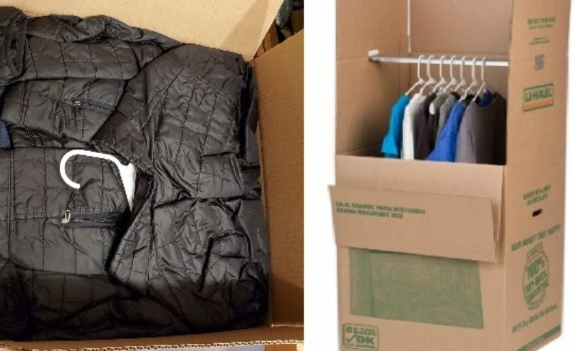 Or, hanging clothes can be folded into medium boxes ($2.24 each by the bundle), Or they can stay hanging in a wardrobe box ($15 to $20 each)
